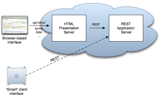 Then, write a second proxy server. This is an HTTP filter, sitting between dumb browsers and your core resources. When browser-based users need to interact with your resources, they actually connect to this proxy. It then talks REST to your main server, and interprets the RESTful responses back into a form that’s useful on the browser. And this filter doesn’t have to be a dumb presentation layer—there’s nothing to say that it can’t handle additional functionality as well. Things like menus, user preferences, and so on could all sit here.