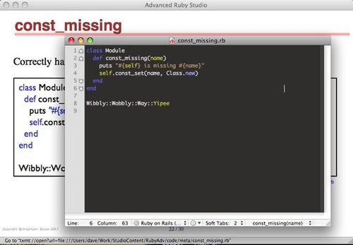 The code gets inserted onto the slide and is syntax highlighted. The blue text below the box shows the file name (so attendees can find it in their collateral material). It’s also a txmt: hyperlink—click it and the file opens in Textmate, so we can edit and run it.